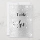O número da tabela é escrito com um script de estilo elegante com letra manual. Letras negras, um fundo de prata sujo com poeira brilhante falsa, faíscas.