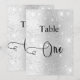 O número da tabela é escrito com um script de estilo elegante com letra manual. Letras negras, um fundo de prata sujo com poeira brilhante falsa, faíscas. Se você quiser a mesa número 2, 3 etc, deverá solicitar a segurança como produtos individuais.