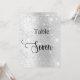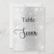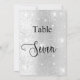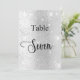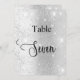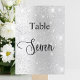 O número da tabela é escrito com um script de estilo elegante com letra manual. Letras negras, um fundo de prata sujo com poeira brilhante falsa, faíscas.