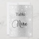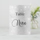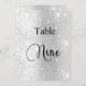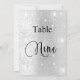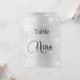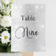 O número da tabela é escrito com um script de estilo elegante com letra manual. Letras negras, um fundo de prata sujo com poeira brilhante falsa, faíscas.