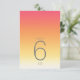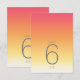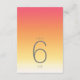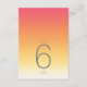 O pano de fundo de todas as peças neste conjunto minimalista de casamento é um gradiente de cores que vai do fundo do rosa a rosa através da tangerina e do amarelo ao branco. A tabela de números de casamento mostrada aqui apresenta um layout moderno e elegante e fonte de sans serif contemporânea para acrescentar ao seu apelo. Adicione facilmente os números da tabela, as iniciais e a data do casamento usando o modelo fornecido. Procure ID741 para ver o conjunto completo de produtos correspondentes no Verão Quente ou escolha uma das outras combinações de gradiente disponíveis para se adequar à paleta de cores do casamento.