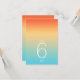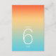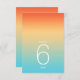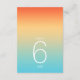 O pano de fundo de todas as peças deste casamento minimalista é um gradiente de cores que se chama de laranja tangerina, passando pelo amarelo-manteiga e a turquesa. A tabela de números de casamento mostrada aqui apresenta um layout moderno e elegante e fonte de sans serif contemporânea para acrescentar ao seu apelo. Adicione facilmente os números da tabela, as iniciais e a data do casamento usando o modelo fornecido. Procure ID741 para ver o conjunto completo de produtos correspondentes no céu tropical ou escolha uma das outras combinações de gradiente disponíveis para se adequar à paleta de cores do casamento.