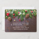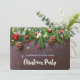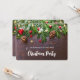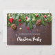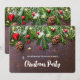 Um convite de festa de Natal com uma fotografia rústica de uma mesa de madeira marrom com pinhas, agulhas de pinheiro, neve e enfeites de Natal. Festivo e encantador.