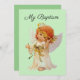 Um anjo fofo com asas, cabelo vermelho, uma roupa branca e uma coroa de flores amarelas.