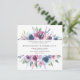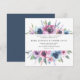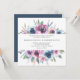 Convites de casamento florais elegantes exibindo os detalhes do seu casamento emoldurados por uma moldura superior e inferior de flores de aquarela roxas, mauves e azuis com folhas verdes exuberantes. A parte de trás apresenta um fundo azul escuro sólido. Projetado para combinar com nossa coleção de casamento Midnight Blooms.