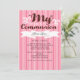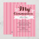 Comece a comemorar com este convite para aquela comunhão especial. O plano de fundo tem várias cores de listras cor-de-rosa. No topo do centro há "Minha Primeira Comunhão" em uma fonte grande. Abaixo, há uma faixa onde você personaliza com o nome da garota. Adicione as informações da sua parte sob isso para personalizar. Veja os muitos outros itens nesta linha, como etiquetas, postagens, notas de agradecimento e muito mais.