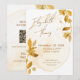 Minimal Autumn Golden Botanical Script Wedding Invitation. This minimal wedding invitation features flowing script names paired with soft autumn gold botanical accents and a light parchment-style wash. The design balances warmth and simplicity, allowing the couple’s names to feel personal while keeping the overall layout clean and modern. The reverse side includes a matching layout with a QR code, website link, and RSVP details for easy guest responses. Subtle gold tones and airy spacing create a calm, refined look that works beautifully for elegant, relaxed, or contemporary weddings.