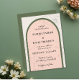 This unique wedding invitation features a clean, contemporary design centered around a bold dark green arch. The arch is overlaid on a delicate blush pink background with subtle line art floral sketches peeking through. This minimalist aesthetic is perfect for the modern couple.