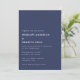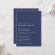 Este convite de casamento moderno apresenta um fundo marinho ousado com texto branco minimalista numa combinação de fontes clássicas de serif e sans serif limpas. Perfeito para casais contemporâneos planejando um casamento em galeria, loft, ou urbano, este design dá uma sensação elegante e eterno. Personalize com seus nomes, data e local para um toque personalizado e polido.
