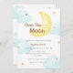 Convite para chás de fraldas bonito e adorável, apresentar uma nuvem verde azul brilhante, estrelas luas e douradas com palavras "Sobre a Lua". desenhado com estrelas de aquarela, nuvem azul e lua. Perfeito para o tema da lua chá de fraldas e das estrelas de um bebê e de uma menina. Você pode personalizar texto e cor.