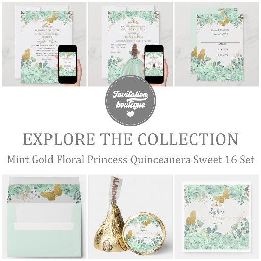 Convites Mint Dourado Floral Princess Butterfly Sweet 16