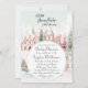 Um chá de fraldas encantador com uma hortelã e uma aquarela cor-de-rosa Fairytale Cena de inverno com casas confortáveis, árvores de Natal e neve à espera de um pequeno floco de neve! Você pode personalizar este convite com seus próprios detalhes.