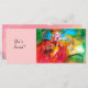 Caráter mascarada veneziano colorido, caprichoso e vibrante. Uma loura sofisticada e bonita está sentada com uma rosa vermelha e uma máscara de penas na mão com tecidos espumantes de ouro, de um figurino barroco mascarado, com penas e um cachorro. Pintura aquosa com cores brilhantes em cor azul-amarela rosa, verde, faíscas douradas e folha prateada, inspirada em personagens de Comédia de Arte ( Commedia dell' Arte ), Carnaval de Veneza e máscaras de penas venezianas.Este design legal e artístico é perfeito para casamentos, cerimônias nupciais, chás de panela, doce 16,festas de aniversário de quinceanera festas, bolas de dança em fantasia, noivados românticos, salvar os anúncios de data, festas de férias, reuniões familiares, coquetéis, celebrações de dia do ano novo, aniversários, reuniões, concertos, recital ou qualquer evento que você queira.