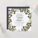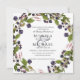 Folhas elegantes, galhos e bagas inspiraram design de convite para o casamento, apresentando framboesas e mirtilos em fundo branco que apavora seus nomes e detalhes de casamento. Cartões que se revertem a um roxo sólido coordenado Um design moderno e clássico para casamentos quic elegantes no outono ou no inverno.