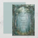 This piece invites your guests into a realm of quiet magic and deep serenity. An intricate, dark metallic archway with delicate filigree frames a breathtaking vista of a fog-shrouded woodland path. Slender, towering trees reach toward a hazy emerald sky, while soft white blossoms and lush green foliage create a multi-layered, painterly texture. The moody teal and grey color palette evokes a high-fantasy, romantic atmosphere that feels both ancient and timeless. As a wedding invitation, this design is a magnificent choice for a mystical outdoor ceremony, a gothic-inspired woodland union, or a grand fairytale celebration. it sets an unforgettable tone of wonder and enchantment, serving as a beautiful gateway to your special day.