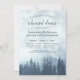 Este convite de janto de ensaio de casamento apresenta um design rústico, mas elegante, com caligrafia de guião sobre um fundo de aquarelas de pinheiros azuis envoltos em nevoeiro ou névoa. As cores são uma variedade de tons de ouro verde, branco e pálido, fazer este convite perfeito para uma cerimônia ao ar livre, selvagem ou de florestas traseiras.