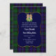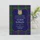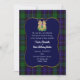O convite para o casamento do clã escocês Mitchell feito no padrão clássico de xadrez azul e tartã verde, com uma área de texto decorativo azul borrado em ouro. Gráficos de duas cabeças de unicórnio com um punho entre elas, decoram o topo do convite. Personalize o texto personalizado branco para se adequar ao seu casamento temático em terras altas.