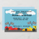 Este convite de aniversário bonito do carro de corridas dos miúdos caracteriza dois carros de corridas e bandeiras checkered.