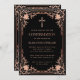 Este elegante convite de confirmação a cor-de-rosa-rosa-ouro e preto com ar de vintagem, recomendado para uma menina, tem uma estrutura de folha de ouro-rosa ornamentado (faux) com decorações barrocas elegantes em fundo preto. Acima do texto, há uma cruz religiosa em ouro rosa. Exceto a ocasião "Confirmação", que também está em ouro-rosa, todo texto pode ser personalizado e tem uma cor semelhante à do quadro de ouro-rosa. A safra, quadro de ornamentado, baseia-se numa antiga ligação francesa ao cobrir de livro, de Georges Mercier (1885-1939) - Madame de Maupin, por Theophile Gautier, edição de 1911, agora no dominio público.