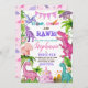 Bonito convite de aniversário em estilo. Tema: Festa de Dinossauro Menina. Ocasião: aniversário de 3 anos. Estilo: Bonito, Cheio, Divertido, Elegante. Cores: Rosa, Roxo, Verde, Turquesa. Gráficos: Dinossauros De Cores Aquáticas, Árvores Tropicais, Bolo De Aniversário.