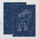 O verso do cartão postal mostra constelações gráficas brancas sobre um fundo azul marinho.