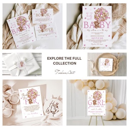 Bem-vinda à sua menina com a coleção de chás de fraldas encantadora de TsikonArts! Descubra este lindo urso branco rosa chamado "é uma menina" convite que apresenta um adorável ursinho de pelúcia aninhado entre balões cor-de-rosa macio, colocado contra um cenário sonhador de corações cor-de-água, cor-de-rosa-bebê.