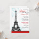 Convites de chá de panela elegantes e modernos parisienses com uma Torre Eiffel em escala de cinza sobre uma borda vermelha de baixo com azul aqua floresce atrás dela.