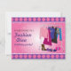 Um convite de festas para a diva de moda que pode trabalhar naquela pista como se não fosse assunto de ninguém! Um conjunto de roupas e acessórios é apresentado contra um fundo estrelado cor-de-rosa, enquanto no reverso o rack foi limpo deixando apenas hangares vazios. Disponível com produtos correspondentes.