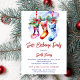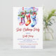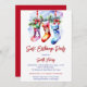 Meias de aquarela da festa da bolsa de Natal pendurada em uma fita vermelha em um snowflakes de pinheiro convite para modelo de convite instantâneo de fonte.