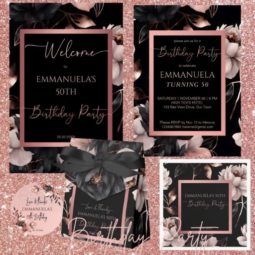 Festa de aniversário ouro negro elegante rosa floral editável convite para modelo instantâneo descarregamento digital instantâneo, peões de cor aquática de rosa preto cartão de festa de aniversário negro de fundo preto