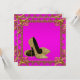 Convite de festa de aniversário de qualquer idade para meninas e mulheres com sapatos de salto alto brilhantes de ouro rosa intenso.