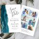 Este elegante e moderno salve o cartão de data apresenta uma cor azul lacrimejante agata borda com falso brilho prateado. O texto personalizável é uma cinza de carvão em um fundo branco. Substitua facilmente as cinco imagens de exemplo na parte traseira do cartão por suas fotos e adicione um texto breve com informações adicionais (como o URL do seu site).