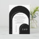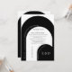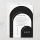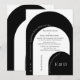 Make a bold statement with this Modern Black and White Wedding Invitation. Featuring a striking abstract arched design, this invitation utilizes high-contrast geometric shapes to frame your wedding details with artistic flair. The clean white text pops against the solid black background, showcasing a sophisticated mix of classic serif typography and contemporary layouts. This unique design includes a vertical "E + D" monogram and curved text accents that wrap around the arched elements, perfect for an avant-garde city wedding, a modern art gallery ceremony, or a high-fashion black-tie event.