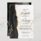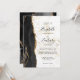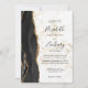 The left-hand edge of this elegant modern wedding invitation features a black watercolor agate border trimmed with faux gold glitter. The customizable text combines black handwriting, copperplate and italic fonts on a gold and white marble texture background. The reverse side features a matching black and gold agate design.