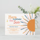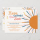 Um retrato colorido bonito, "aqui vem o filho", convite para o chá de fraldas, design com um raio de sol colorido com uma tipografia colorida azul, laranja, rosa, "Aqui Vem O Filho". Perfeito para o tema do sol do chá de fraldas do bebê. Você pode personalizar texto e cor.