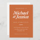 Parte de uma suíte de casamento. Um convite de casamento laranja minimalista do terracotta com um design tipográfico e uma serifa inspirada no art nouveau que é perfeita para o outono ou para a noiva do outono. A parte de trás do convite contém um design de monograma simples opcional. Personalize facilmente substituindo cada informação. Escolha o seu hoje.
