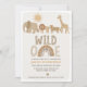 Modern Natural Tones Boys Safari Wild One primeiro aniversario Invitation Cute moderno safari temático selvagem um primeiro convite de aniversário apresenta quatro animais cártaros bonitos em tons naturais, um sol, chita impressão e arco-íris. Esse doce convite de aniversário selvagem é ideal para quem procura um convite de safari selvagem num estilo moderno.