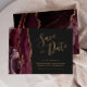 Este elegante e moderno salve o cartão de data apresenta uma borda de cor d'água borrifada, aparada com falso brilho dourado. O texto personalizável combina um script de manuscrito dourado, fontes em copperplate e itálico em um fundo de cinza de carvão escuro. O lado inverso apresenta uma burgundy e uma design de agata dourada.