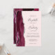 The left-hand edge of this elegant modern wedding invitation features a burgundy watercolor agate border trimmed with silver faux glitter. The customizable text combines handwriting, copperplate and italic fonts in charcoal gray on a blush pink background. The reverse side features a matching burgundy and silver agate design.
