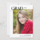 Este cartão com fotos de graduação moderno apresenta um layout editorial chic e uma grande foto. Na frente, "Formando" é escrito em simples, modesto, todos os bonés que aparecem no topo à esquerda, com o ano de graduação à direita. O design de tipografia se sobrepõe a uma grande foto vertical. Na parte inferior, adicione o nome do formando e a escola. A tipografia é preta-chic contra fundo branco. A parte traseira da placa de graduação inclui um modelo opcional para adicionar detalhes da festa de formatura.