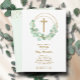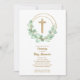 Os convites batizantes elegantes apresentam uma cruz falsa dourada, uma coroa de folhas de eucalipto e os seus detalhes em caracteres quicos na frente e pontos dourados em verde pálido no verso. Perfeito para a primeira comunhão do seu filho, batismo ou batizar. Itens CORRESPONDENTES disponíveis em nossa loja.