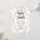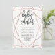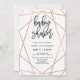 Este convite para o chá de fraldas apresenta um design geométrico moderno, falso rosa de ouro, sobre fundo branco, com a tipografia negra moderna.
