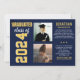 Lindo Modelo de Invitacion de Graduado con estilo de graduado de secundaria con esta invitación de graduacióncon 2 fotos e invitación de fiesta. La tarjeta "Ahora y después", de dos caras, muestra dos fotos del Graduado (una foto actual y otra más antigua de su primer día de escuela) con un diseño simple y masculino con letras inspiradas en jersey deportivo. Los colores Azul marino y dorado, hacen de esta invitacion una linda invitacion elegante para tu graduacion de Hombres o Mujeres **Consejo de fotos: recorta tus fotos en una forma cuadrada antes de subir.
