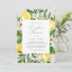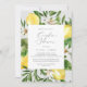 Este convite para casais de limões modernos é perfeito para um primavera ou chá de casamento de verão. O design mediterrânico rústico apresenta limões aquosos brilhantes e bonitos com flores brancas boêmicas e folhas verdes elegantes.