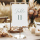 A modern table number card featuring minimal script and lines, perfect for guiding guests to their seats with a simple, refined look that complements any contemporary wedding setting.