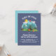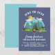 A cute camping scene with pine trees, a tent, a barbecue, a picnic basket, a guitar, a log fire, a volleyball, a sunlounger and beach umbrella, a suitcase, a radio and a kite. The background is navy blue. "HIKE ON OVER" is curved over the top in big, bold capitals and your custom party details appear underneath. View the collection linked on this page for matching items.
