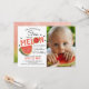 Moderno em um Convite de aniversário Melão, com fotografia da criança de aniversário, um design contemporâneo de uma melancia, sementes de melancia, o texto "nosso pequeno docinho é" e um modelo de aniversário que é fácil de personalizar.