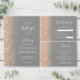 The left-hand edge of this elegant modern wedding invitation features a peach faux glitter border. The customizable text combines white handwriting, copperplate and italic fonts on a gray background. The reverse side features a matching gray and peach glitter design.