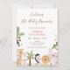Cute girls safari party animals birthday invitation in pastel colors featuring various jungle animals, trees, foliage and pink balloons. This party animals birthday invitation can be used for any age.
