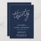 Modelo simples, moderno, elegante e chic, com convite de festas de marinho, com fundo de textura azul-aniversário de 30 anos (este é um efeito digital, não textura real), a palavra THIRTY coberta por rochas (simuladas, não pedras reais), roteiro de caligrafia moderno e tipografia em fontes modernas. Uma design chic, elegante e moderna para uma mulher no seu trigésimo aniversário, para uma reunião de aniversário elegante, uma festa de janto ou qualquer outro caso elegante.
